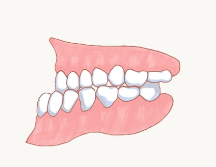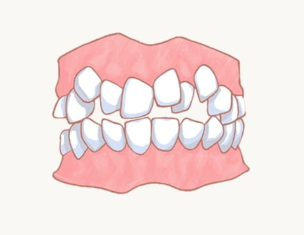 叢生(そうせい)とは、歯が凸凹に生えてくることをいいます。いわゆる「八重歯」などが叢生にあたり、見た目のコンプレックスになりやすいほか、ブラッシングが行き届きにくいため、虫歯や歯周病にかかるリスクが通常よりも高くなります。